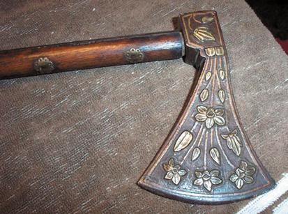 Но практическая реализация конструкции с топорищем у лезвия абсур-дна, поэтому идут другим путем — изгибанием рукояти топора в сторону лезвия. Причем нередко кривизна топорища выполняется с таким расчетом, чтобы та часть топорища, к которой прикладывается сила руки, находилась как можно дальше от продольной линии обуха и ближе к линии лезвия, а идеальным по меткости удара топором считается такой, в котором линия рукояти проходит вообще впереди линии лезвия. А там, где приходится рубить очень толстые деревья и где используют очень длинные, но прямые рукояти, там топоры насаживаются под углом к топорищу, чем хотя бы отчасти достигается условие правильной рубки. Таким образом, понятно, что рукоять (топорище) делается изогнутой для удобства пользования им широким кругом пользователей. Но это для топора-инструмента. Для боевых же топоров эти соображения несущественны и поэтому они имеют максимально простую форму — прямую цилиндрическую. Такую же рукоять имеет и томагавк.