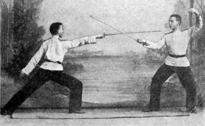 Закрываясь, один противник раскрывает сильно в этой же линии другого, отсюда происходит необходимость в перемене ангажемента. Применить ангажемент, значит, из одной линии перейти в другую. Чтобы переменить ангажемент, надо ослабить действие пальцев правой руки, слегка опустить конец своей рапиры настолько, чтобы он мог пройти под рапирой противника. Как только конец рапиры минует рапиру противника, нажатием пальцев конец рапиры поднимается кверху по другую уже сторону рапиры противника, а затем надо закрыться в нижней линии ангажемента, как было выше указано, т.е. отвести рапиру противника настолько, чтобы он не мог нанести прямого удара.