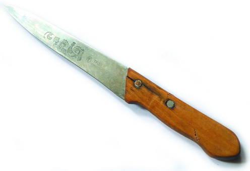 Нож с клинком, изготовленным из легированной (нержавеющей) стали, представленный на фото 1, имел деревянную рукоять. Она была выполнена из бруска с минимальным объемом работ по его обработке для придания рукояти формы. Обработка заключалось в создании неглубокого рельефа в нижней части рукояти (чтобы удобнее держалась в руке), а также легком закруглении ребер. Клинок крепился к ней установкой черенка в пропил рукояти, и фиксировался там двумя алюминиевыми заклепками. Именно такие деревянные рукояти, не требующие особых трудозатрат, удобны в серийном массовом производстве.