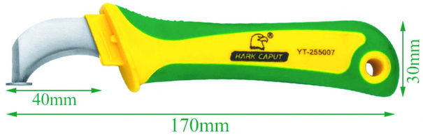 Представленный фирмой HARK CAPUT нож электрика (нож для зачистки кабеля) представляет собой две вариации — с острым кончиком лезвия и с пяткой на кончике, которая позволяет надрезать внешнюю изоляцию кабеля, не повреждая изоляюцию жил… Материал рукояти — резина. Материал лезвия — нержавеющая сталь. Длина, мм — 170/180. Ширина, мм — 30. Твердость лезвия, HRC — 55 . Масса, г — 120.