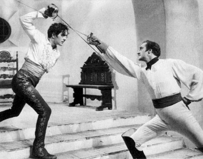 В кинематографе Зорро, наряду с Д\'Артаньяном, позиционируется как великий фехтовальщик всех времен и народов. Именно Фербенкс, по большому счету, впервые вывел фехтование на голливудский экран. Напомним, что Лига фехтовальщиков-любителей Америки, в которой состоял и Фербенкс, была основана еще в 1891 г. Хотя, по логике вещей, оружием Зорро является шпага, сам Фербенкс, в фильмах употреблял обычно спортивную саблю-эспадрон. Его примеру последовал и Зорро нового поколения — Tyrone Pover, сыгравший в первом звуковом римейке «Знака Зорро». Он и его vis-a-vis Basil Rathbone, в роли губернатора, считались отличными фехтовальщиками своего времени. Их поединки признаны классикой фехтовального жанра в американском кино. Только смотреть на них современному зрителю, не искушенному в тонкостях фехтоваания, непроходимо скучно.