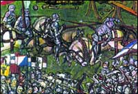 Каждый помнит сцены из многочисленных фильмов о Робин-Гуде, в которых рыцарь-король Ричард Львиное Сердце (1157-1199 гг.), облаченный в кольчугу (в псевдоисторических фильмах в пластинчатых латах), сражается под алым с золотыми шнурами стягом, перекрещенным белым крестом и, появляясь перед братом Иоанном I Безземельным (1166/67-1216 гг., королем Англии с 1199 по 1216 г.) в полной боевой амуниции с копьем и мечом, заставляет того дрожать от страха за свою собственную жизнь. Как известно, король Ричард Львиное Сердце - один из предводителей рыцарей в третьем Крестовом походе - заключил перемирие с султаном Саладином в 1192 г. и, возвращаясь в Англию через немецкие земли, был схвачен по приказу немецкого императора и заключен в неприступный замок. Он пробыл в заточении целый год, пока родственники не выкупили его за огромную сумму.