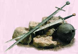 Самым благородным и распространенным оружием рыцарей был, как известно, меч. Именно им рыцарь сражался в бою, и это же оружие служило ему верой и правдой в благородном поединке. Во время боевых действий использовались копья, боевые топоры и боевые молоты. В сражении жизнь рыцаря зависела часто от прочности и гибкости меча. Причем, ни длина лезвия, ни масса меча не являлись основными характеристиками, определяющими силу удара. Главное - это расположение центра тяжести и балансировка. Обычно у рыцарского меча XI столетия длина лезвия варьировалась от 60 до 80 см, форма - конусообразная.
