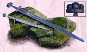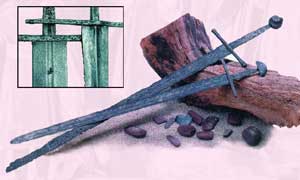 Хороший меч весил от 1,2 до 1,5 кг и лучше всего, если он был изготовлен из твердой упругой стали. Чтобы изготовить качественную сталь для меча скручивали поочередно мягкие железные и стальные стержни и проковывали их, придавая поковке форму лезвия. Из такого металла (взаимно переплетенных железных и стальных стержней) получался превосходный Клинок. Позднее стали изготавливать мечи длинной до 125 см и обрабатывать их на точильном камне. Рукоятка меча практически не менялась, оставалась прямой с длиной поперечиной и выглядела как символ-крест. У некоторых мечей рукоятки были инкрустированы серебром, а в наверешие-противовес помещалась религиозная святыня - амулет.