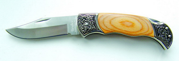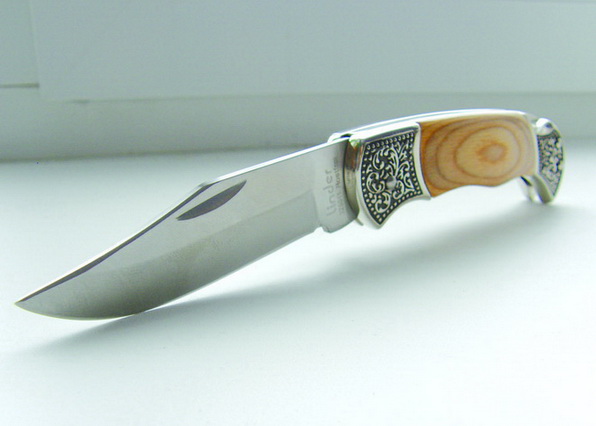 Модель 325011 имеет достаточно традиционный дизайн — небольшой Клинок, удобная рукоять, замок бек-лок, притины с растительным орнаментом и деревянные накладки на рукояти. Поставляется в картонной коробке фиолетового цвета с белой надписью Linder (фото 24, 25).
