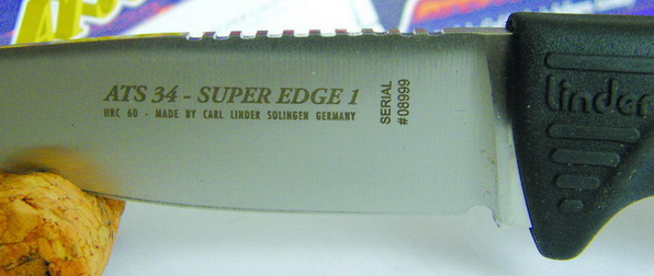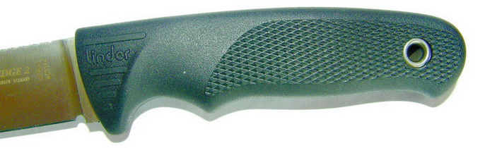 Если по поводу стали ATS-34 все относительно ясно и понятно — данная сталь достаточно давно используется для изготовления клинков и не только компанией "Carl Linder Nachf."; то относительно рукояти, я считаю необходимым сказать несколько слов. Рукоять выполнена из современного резинопластика (кратон) черного цвета, оснащена анатомическими выемками для пальцев и рифленой насечкой, которые, однако, не мешают держать нож ни прямым, ни обратным хватом. Рукоять ножа имеет средние размеры, которые позволяют работать ножом, как голой рукой, так и рукой в перчатке. В торце рукояти имеется темлячное отверстие, усиленное развальцованной стальной трубкой. В начале рукояти, возле основания клинка, методом штамповки нанесена надпись Linder. Хвостовики клинков в модельном ряду Super Edge не доходят конца рукояти всего на 1/8 дюйма.