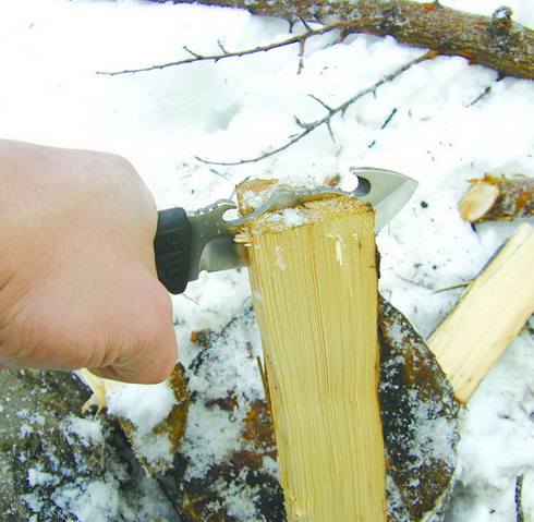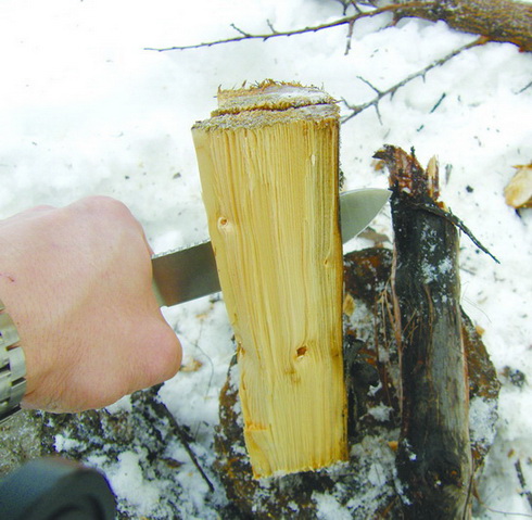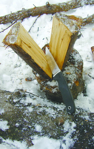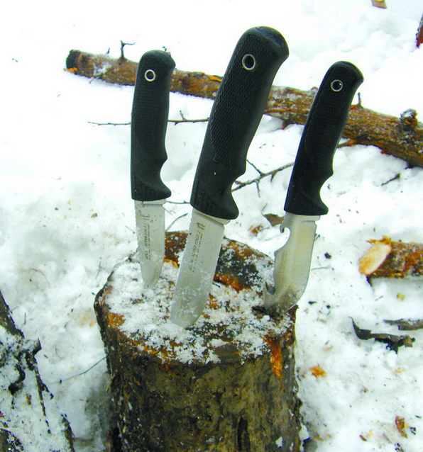 Итак, рассмотрев ножи с некоторой тщательностью, давайте посмотрим, что же этими ножами делалось. Попали они ко мне в канун нынешнего Рождества. "А почему бы и нет?" — спросил я себя и устроил ножам шашлычно-кухонный тест. Ножи были взяты на природу и подверглись процедуре нарезки мяса на шашлык, приготовлению всевозможной закуски из овощей (как свежих, так и солено-квашенных) и фруктов. Самое тяжелое испытание досталось ножам по нарезке щепок из нескольких относительно сухих сосновых досок, и колке дров для приготовления шашлыка (дрова — это промерзшие на последних морозах поленья).