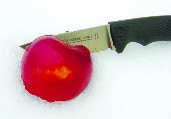 Нарезка хлеба дала в полной мере оценить длину клинка ножа Super Edge-2 — 11 см против 9 см дали неоспоримое преимущество. Нож Super Edge-1 занял второе место — сыграла свою роль геометрия клинка. Работа по сырым овощам и фруктам далась всем ножам с легкостью, правда Super Edge-4 твердые продукты (яблоки, морковь, картофель, лук) больше колол, чем резал — специфика своеобразной геометрии. Если говорить о нарезке соленостей, а именно соленых огурцов, все ножи справились "на отлично". Резались ножом и цитрусовые — лимоны и апельсины. Я специально оставлял ножи после соленостей и цитрусовых не вытертыми — на ножах не появилось ни единого пятнышка коррозии. Также несколько раз ножи бросались в снег, после чего лежали не вытертыми — результат тот же — коррозия им не страшна.