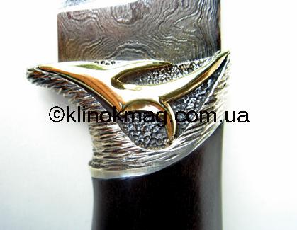 Используемые материалы: дамаск, эбен, серебро — 85 г, золото — 10 г, желтые бриллианты.
