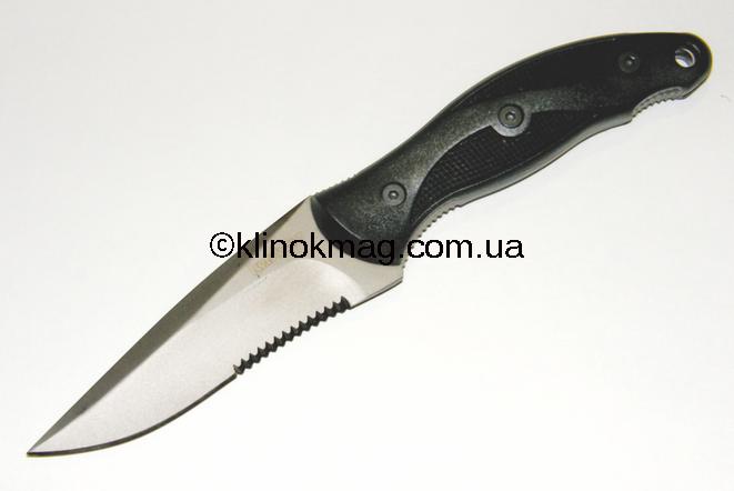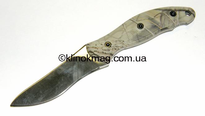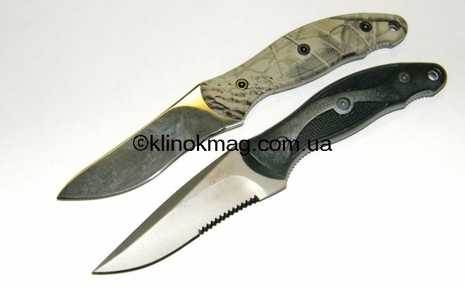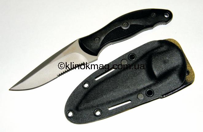 Нож «Vertigo» модель 1080ST (471080 — по каталогу «Carl Linder»). Нож изготовлен из достаточно современных материалов — клинок сталь AUS8A, рукоять из прочного пластика, ножны — кайдекс с системой подвеса (горизонтальное и вертикальное расположение ножа на одежде или снаряжении). В данной модели, хоть она и очень похожа на нож «Echo», присутствуют несколько принципиальных отличий — клинок имеет более хищный и стремительный вид за счет слегка опущенного, относительно линии обуха, кончика, а также серрейтора, нанесенного в первой трети клинка. Спуски — 3/4 клинка, не заточенное «фальш-лезвие». Клинок имеет слегка выраженную S-образную режущую кромку. Сталь AUS8A и легкое матированное покрытие клинка увеличивают антикоррозионные свойства. Серрейтор, хоть и простой, но очень агрессивный. Еще один плюс такого серрейтора — отсутствие отдельных тонких острых зубцов — весь серрейтор равномерный. Рукоять, как и у модели «Echo», выполнена из пластика и имеет такие же достоинства и недостатки. Ножны, изготовленные из кайдекса, плотно и надежно фиксируют нож. Наличие дополнительных технологических отверстий, облагороженных люверсами, позволяют с помощью шнуров использовать дополнительное крепление ножен к обмундированию. Нож очень удачный и продуманный (фото 4-7).