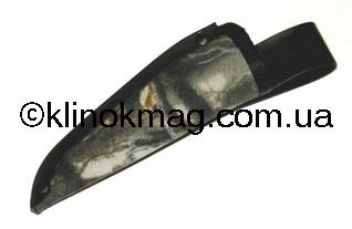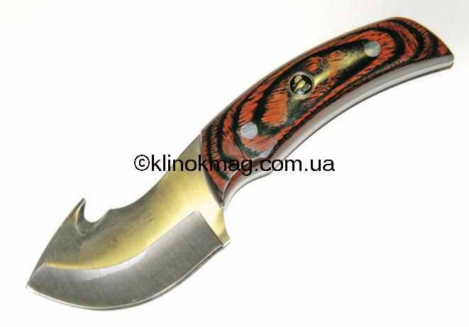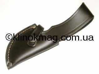 Начнем, пожалуй, с самого необычного ножа — модель 511372 по каталогу «Carl Linder» — классический охотничий скинер, оснащенный шкуросьемным крюком. Нож имеет относительно небольшой и широкий клинок. Спуски — чуть меньше 1/2 клинка, массивная деревянная рукоять с небольшими анатомическими выемками под пальцы. Удобное углубление под палец на обухе. Материал клинка 440 сталь. Ножны из натуральной кожи, прошиты и в двух местах усилены заклепками. Обычная петля для вертикального подвеса ножа. Нож дополнительно фиксируется хлястиком на кнопке. Почему-то вспоминается диснеевский мультик «Вини и Слонотоп». Так вот это и есть Слонотоп (фото 11-12).