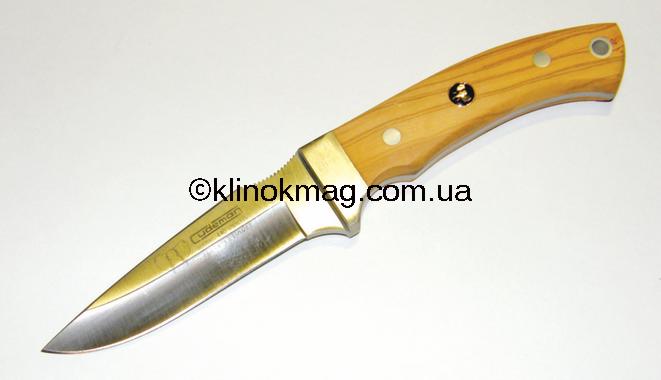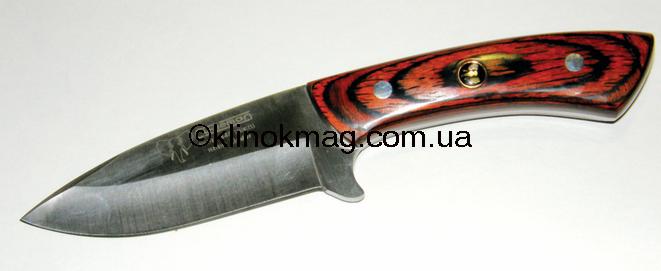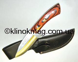 Модель 512221 по каталогу «Carl Linder». Этот нож слегка напоминает предыдущий — что-то есть в них такое мимолетно-общее. Однако отличий намного больше, чем мнимой похожести. У ножа модели 512221 большой скос обуха к кончику, что придает клинку некоей «хищности». Спуски — 1/2 клинка. В меру длинный и широкий клинок. Массивная деревянная рукоять с небольшим изгибом и расширением к концу рукояти, а также стальным торцом. Рукоять заканчивается прямоугольной проушиной, которая дает возможность прикрепить темляк или страховочный шнур, чтобы исключить возможность потери ножа. Накладки из светлого, приятного на ощупь, дерева. На обухе, возле самой рукояти, сделано небольшое углубление с нанесенной поперечной насечкой — упор для пальца при выполнении силовых работ. Ярко выраженный ограничитель сформирован пяткой клинка. Материал клинка — 440 сталь. Ножны из натуральной кожи, прошиты и в двух местах усилены заклепками. Петля для вертикального подвеса ножа. Нож дополнительно фиксируется хлястиком на кнопке (фото 15-16).