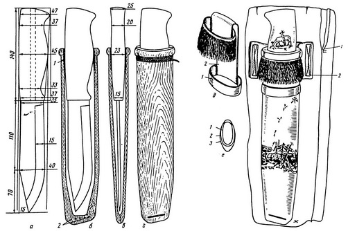 Имеющиеся в продаже ножи с круглыми пластмассовыми рукоятками, пиратскими крестовинами и мягкими кожаными ножнами для использования на промысловой охоте совершенно непригодны. В старой охотничьей литературе не так уж редко можно встретить описания и рисунки промысловых ножей, и, как правило, эти ножи не имеют ни крестовин, ни ограничителей. Непонятно, почему Производственный комбинат МООиР делает рукоятки непременно с этой ненужной частью, причиняющей много неудобства в работе и при ношении ножа. Особенно смехотворны ножны у наших номерных ножей. Они пригодны лишь для перевозки ножа в чемодане. На охоте нож в таких ножнах вы потеряете в первый же день, если не будете придерживать постоянно рукой. А попробуйте вы его сотню раз вынуть и вставить в узкую щель ножен, расстегивая и застегивая каждый раз хлястик на морозе!