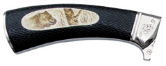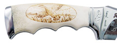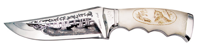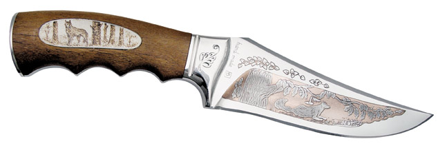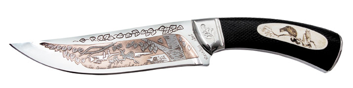 Корр. – Какой материал вы предпочитаете использовать в своих ножах? В. – Традиционные материалы, дающие гарантию качества и не вызывающие сомнения среди охотников и любителей ножей. Для клинков это нержавеющая сталь 95X18, обладающая высокой прочностью на излом и одновременно способная существенно увеличивать показатель твердости при термообработке. К тому же эксплуатация на охоте ножей из этого материала не вызывает сложностей из-за высокой устойчивости такой стали к коррозии. Для рукоятей ножей предпочитаю дерево и кость. Эти материалы красивы, приятны «на ощупь». Именно эти материалы позволяют применить в декоративном оформлении ножа техники, создающие у владельца ощущение традиционности этого предмета. А ведь охота – это одно из самых традиционных занятий человека, и все предметы, имеющие к ней отношение, должны быть носителями выработанных в течение длительного времени признаков охотничьего классицизма.