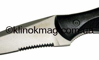 Нож «Vertigo» модель 1080ST (471080 — по каталогу «Carl Linder»). Нож изготовлен из достаточно современных материалов — клинок сталь AUS8A, рукоять из прочного пластика, ножны — кайдекс с системой подвеса (горизонтальное и вертикальное расположение ножа на одежде или снаряжении). В данной модели, хоть она и очень похожа на нож «Echo», присутствуют несколько принципиальных отличий — клинок имеет более хищный и стремительный вид за счет слегка опущенного, относительно линии обуха, кончика, а также серрейтора, нанесенного в первой трети клинка. Спуски — 3/4 клинка, не заточенное «фальш-лезвие». Клинок имеет слегка выраженную S-образную режущую кромку. Сталь AUS8A и легкое матированное покрытие клинка увеличивают антикоррозионные свойства. Серрейтор, хоть и простой, но очень агрессивный. Еще один плюс такого серрейтора — отсутствие отдельных тонких острых зубцов — весь серрейтор равномерный. Рукоять, как и у модели «Echo», выполнена из пластика и имеет такие же достоинства и недостатки. Ножны, изготовленные из кайдекса, плотно и надежно фиксируют нож. Наличие дополнительных технологических отверстий, облагороженных люверсами, позволяют с помощью шнуров использовать дополнительное крепление ножен к обмундированию. Нож очень удачный и продуманный (фото 4-7).