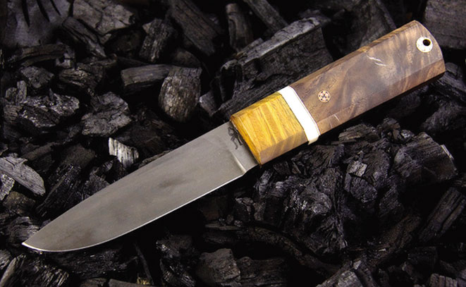 2. Является ли изготовление ножей Вашей основной работой? С какого момента Вы занялись изготовлением ножей профессионально? Изготовление ножей постепенно становится одним из основных направлений моей деятельности, помимо художественной ковки и экспериментальной археологии. 3. Какие материалам для клинков Вы сейчас используете? В своей работе я чаще всего использую стали, которые поддаются ковке, хотя ковать можно любую сталь, вопрос только, насколько ковкой можно улучшить качество исходного материала. Если называть основные марки, с которыми работаю — это У8а-У12а, Х12МФ. Большую часть ножей делаю из дамаска собственного производства, пробую изготавливать булат. Кроме названных материалов я иногда использую стали 95Х18, ШХ15, К110, ДИ90 и некоторые другие. Бытует мнение, и я его сторонник, что марка стали это вторично, а главное — искусность кузнеца, соблюдение режимов термообработки, грамотный строй клинка. Принципиально не использую «быстрорезы». Единственное их преимущество — сохранение твердости при нагреве — для клинка не имеет никакого значения, а вот хрупкость и твердость не добавит радости владельцу. 4. Какие материалы для рукоятей и ножен Вы сейчас используете? Для рукоятей чаще всего использую древесину ценных и экзотических пород, различные капы, в меньшей степени лосиные и оленьи рога, из синтетических материалов — микарту. На проставки идут искусственные камни, вулканизированная фибра, цветные металлы, рог лося. В формах рукоятей придерживаюсь аскетической простоты и эргономичности, многое подчерпнуто из наследия предков. Для пращуров нож был не просто режущий инструмент, а главный друг и помощник в повседневной борьбе за выживание. Я провожу аналогию с известным афоризмом: «Нож — друг человека». Ножны как правило изготавливаются из формованной кожи, реже из дерева. 5. Чем и как определяется выбор материала? Многое зависит от пожеланий заказчика, но бывают моменты, когда проще отказаться от работы чем вступать в конфликт с собственным видением будущего ножа. Для меня и моих коллег нож — кованый Клинок с прямыми от обуха спусками, хвостовой монтаж, деревянная рукоять, ножны из вощеной кожи. Все остальное — согласно художественному замыслу или желанию заказчика, чтобы придать единственный и неповторимый вид изделию.